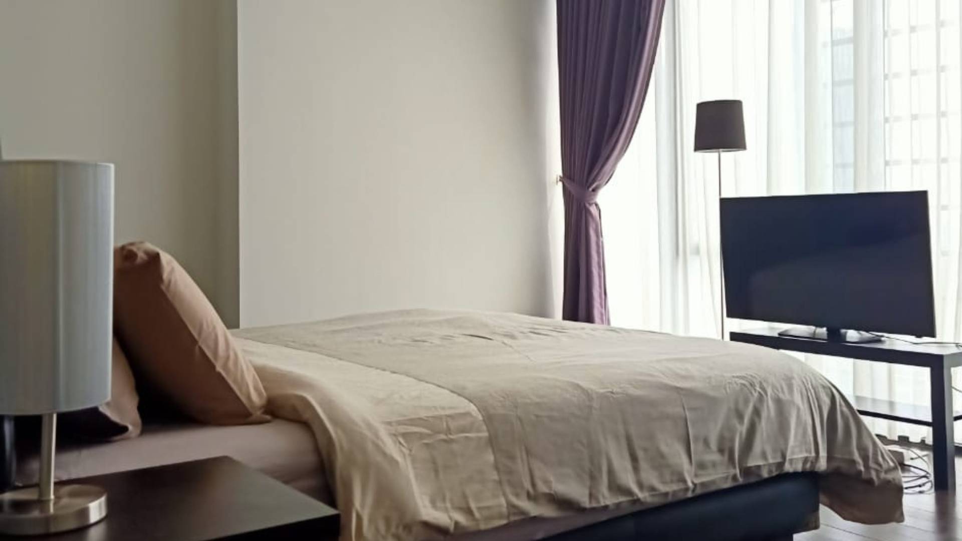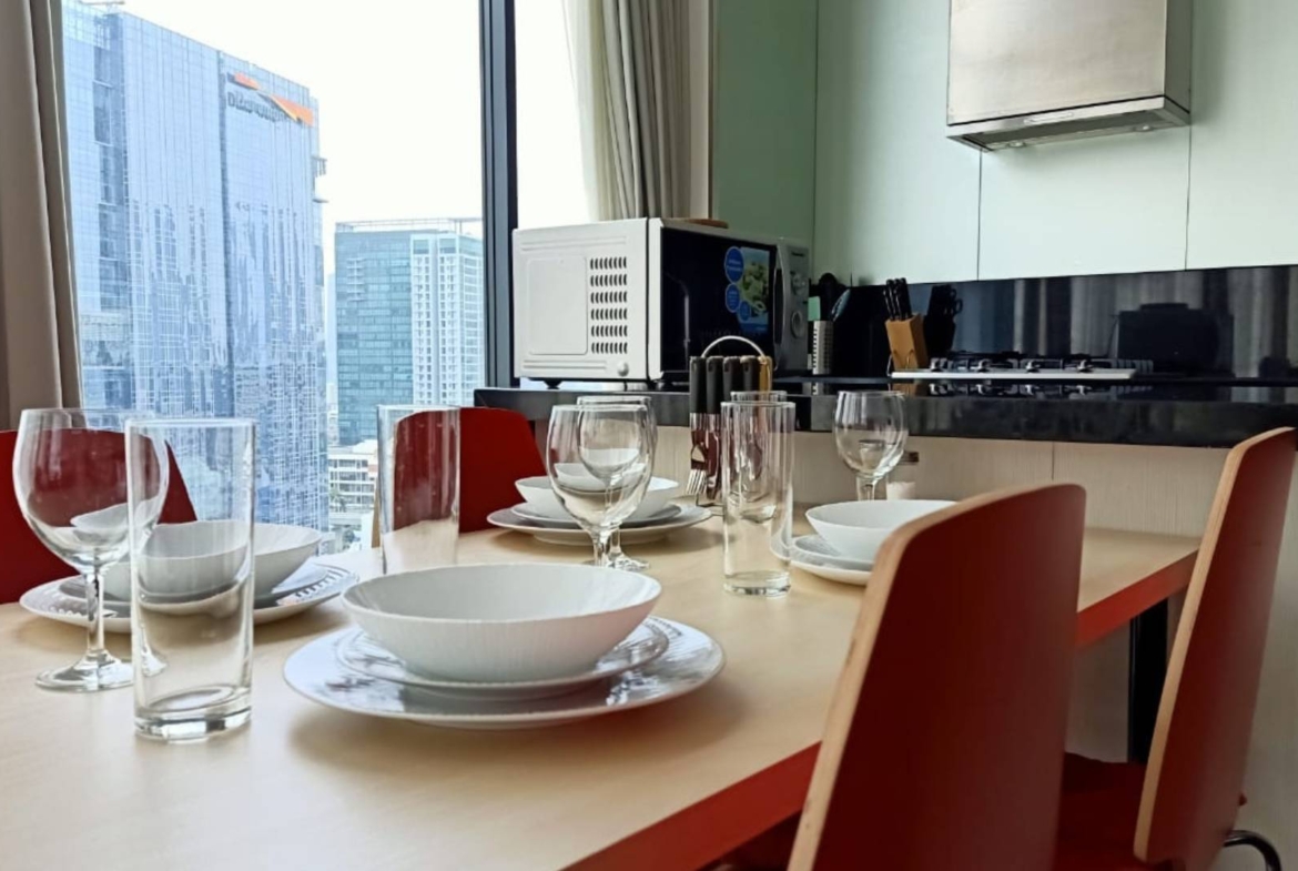The living and dining area is centrally positioned, creating a natural circulation flow throughout the unit. A private balcony extends the main living space, introducing natural light and ventilation that enhance the overall atmosphere. The enclosed kitchen and built-in storage solutions add functional efficiency, while the fully furnished interior allows immediate occupancy. Positioned within Jakarta’s CBD, the residence provides long-term comfort within a secure and professionally managed environment.