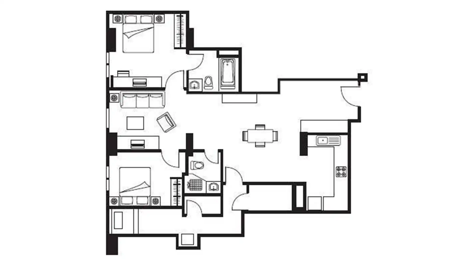 • 115 sqm two-bedroom serviced apartment layout